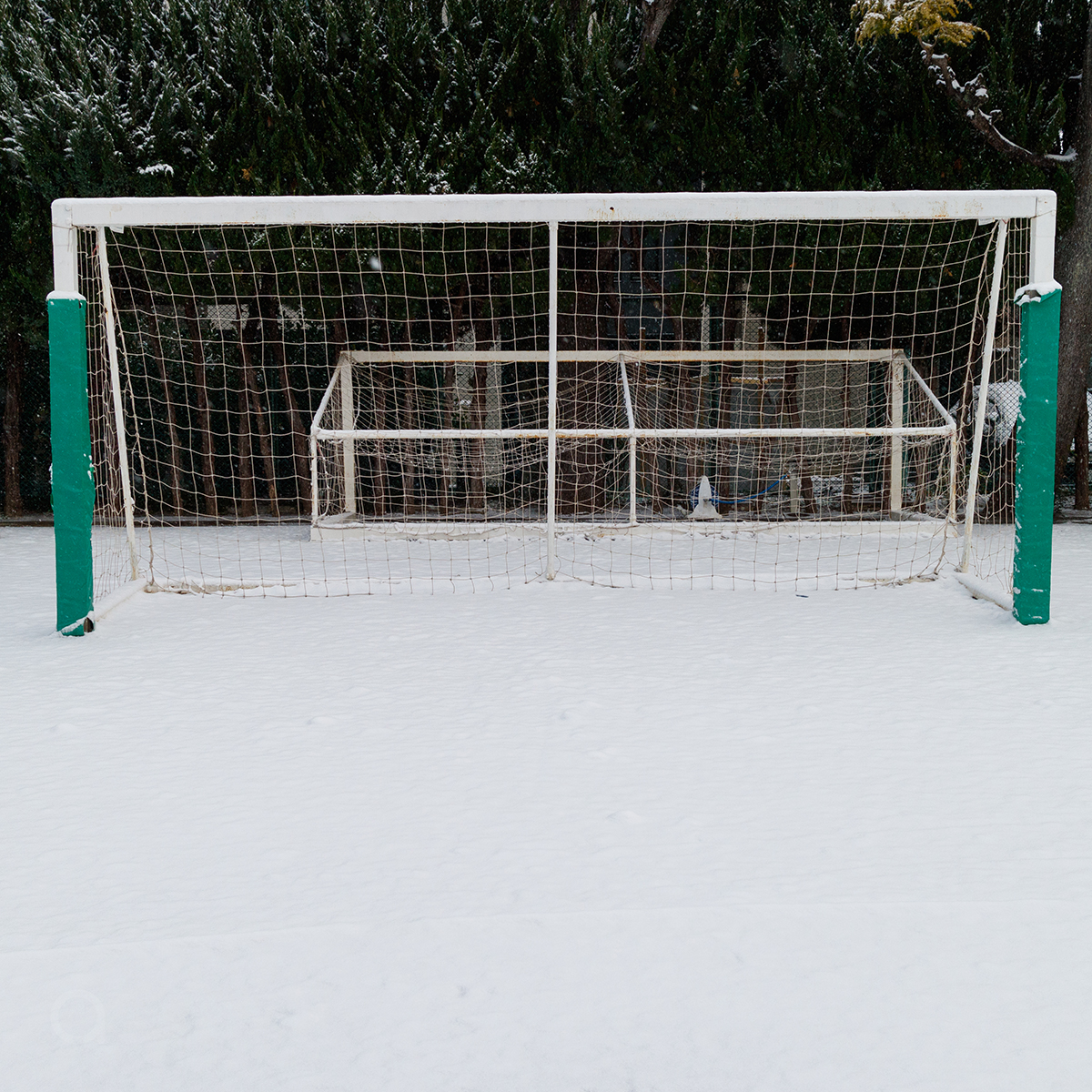 校庭の雪とサッカーゴール